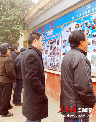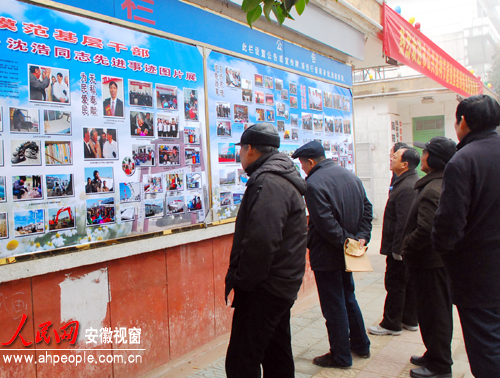 | 凤阳县府城镇部分居民在观看“新时期的模范基层干部——沈浩同志先进事迹图片展”。 |