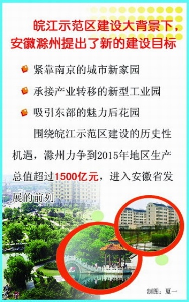 皖江示范区建设给滁州跨越发展带来历史性机遇,滁州市制定了赶超目标,全力打好区位、资源、环境3张牌,积极建设紧靠南京的城市新家园、承接产业转移的新型工业园、吸引东部沿海发达地区的魅力后花园,力争到2015年地区生产总值超过1500亿元,进入全省发展的前列。