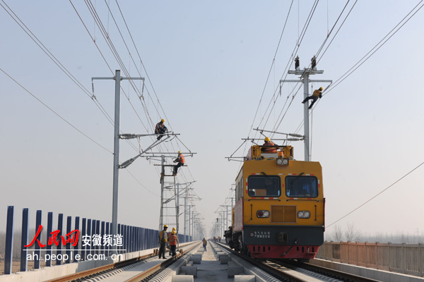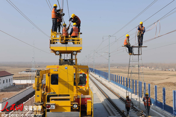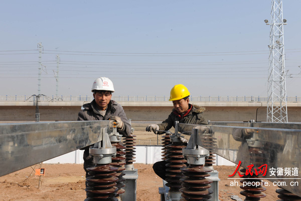 1月8日,中国电气化局施工人员在京沪高铁定远站进行电气化接触网连接线安装作业。当日,安徽省定远县桑涧牵引站进入电气安装冲刺阶段,施工人员对变压器、闸刀、开关进行安装。