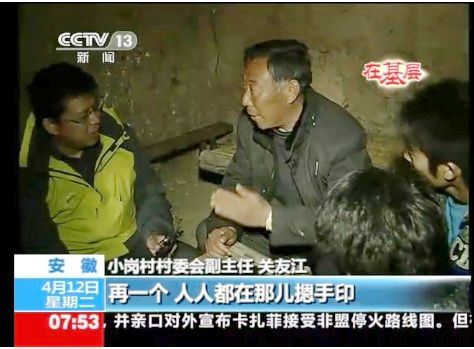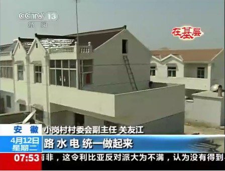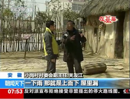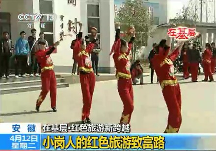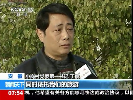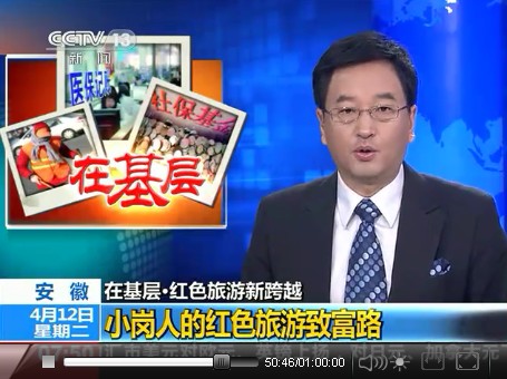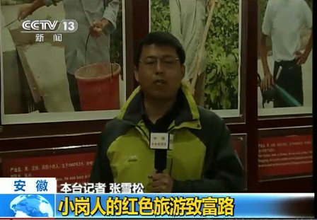 4月12日早上7:51分,中央电视台朝闻天下栏目——“在基层.红色旅游新跨越”专题中播出约3分钟的《小岗人的红色旅游致富路》新闻报道。在随后8点中央一套、新闻频道和四套并机播出的朝闻天下栏目中又进行了重播。该节目一经播出,即被凤凰卫视、人民网—视频以及酷6视频等多家重要媒体或网站转发。(图为央视新闻节目播出时截图)