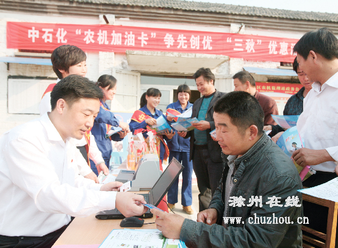 “三秋”时节,中石化滁州分公司联合全市各农机部门,全面启动2011 年“三秋”保供绿色通道,全力做好“三秋”油品保供和便民服务。全市120 座加油站统筹安排,制定农用油保障方案。同时,组织22 台3.5 吨位小型油罐车流动巡回服务,利用配送车、便民油桶,把油品主动送到田间地头,最大限度地满足农民“秋收、秋耕、秋种”所需。图为“三秋”服务人员在南谯区为农机手办理惠油卡。李晓村摄