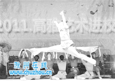 绚丽的舞台,耀眼的灯光,动感的舞蹈,优美的音乐……日前,由省文化厅、省财政厅、省教育厅主办,滁州市演艺公司承办的2011年“高雅艺术进校园”活动,走进我市滁州学院、滁州市职业技术学院、滁州市城市职业学院(卫校校区)三所高校,以歌曲、舞蹈、戏剧等喜闻乐见的表演形式,为广大师生送去一场场精彩演出,赢得师生的热情捧场。图为演出现场。毛鸿冰 摄