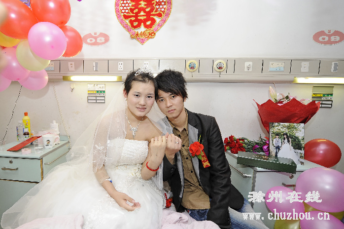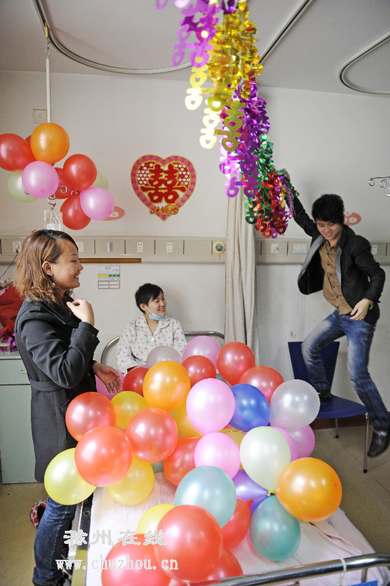 贴喜字,挂彩条,吹气球,昨天上午11时许,记者在病房前看到,新郎李亚峰和亲友们正在忙着布置婚礼现场。穿着一套白色婚纱的黄燕则躺在床上,一边打着吊水,一边看着大家忙碌,脸上不由得露出了幸福的笑容。半个小时后,喜字贴上了病床的墙头,房间里也挂上了彩带和气球,虽然有些简单,但在黄燕看来,这却是世界上最美好的婚礼,而她则是世界上最美丽的新娘,“虽然有疾病缠身,但我的男友和家人对我不离不弃,我觉得我是幸福的。”