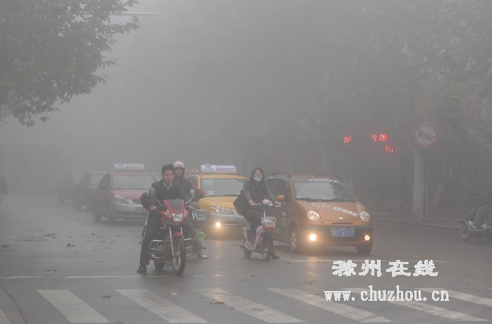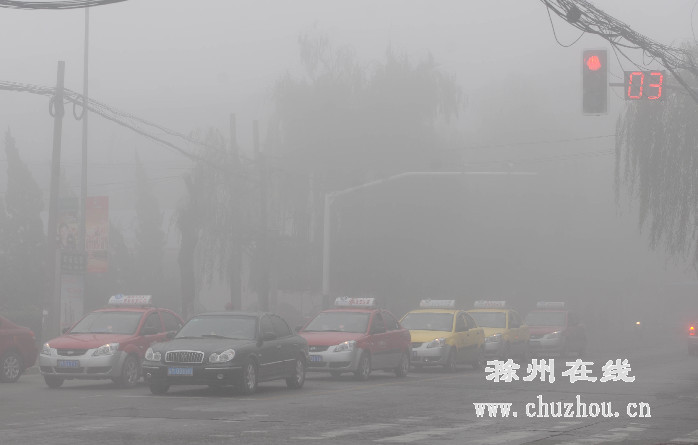 11月18日,滁城被雾霾笼罩,许多路段出现能见度不足50米的大雾,雾霾天气给城市交通和市民出行带来不便,空气质量明显下降。据气象专家介绍,雾霾天气的产生主要是受到湿度影响,近地面风力较弱,空气中的尘埃和杂质无法驱散,残留较多灰尘而形成的,请市民外出注意交通安全,老人和小孩早晨出门最好戴上口罩,防止呼吸道疾病的发生。