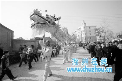 108米长的“江淮第一龙”在乡镇里穿行,引得村民驻足观看。