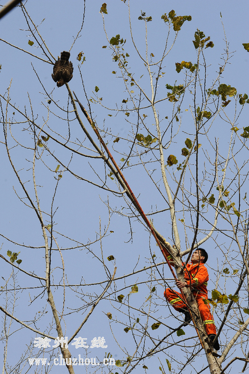消防战士爬树救鹰。记者 计成军摄