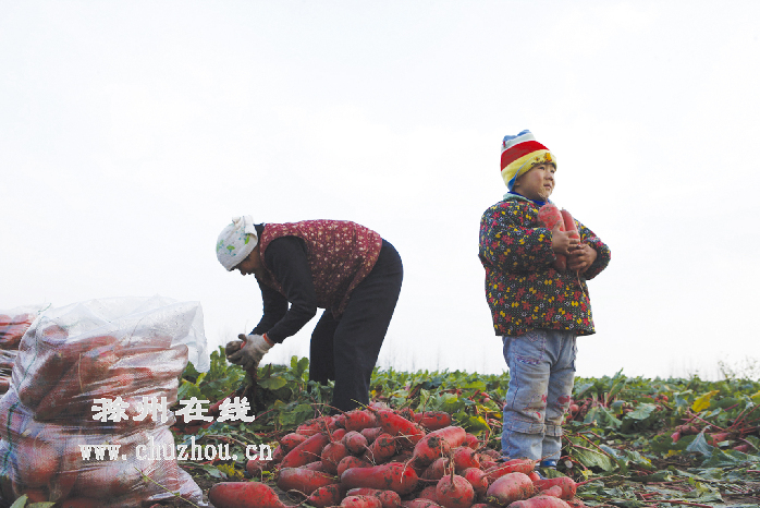 安全村五岁的留守儿童张波和奶奶在田里收萝卜。