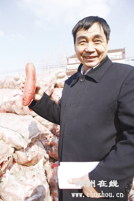 南京客商刘国彦手拿萝卜、爱不释手,对萝卜销售充满信心。
