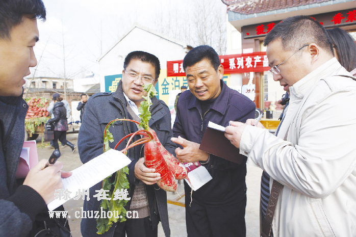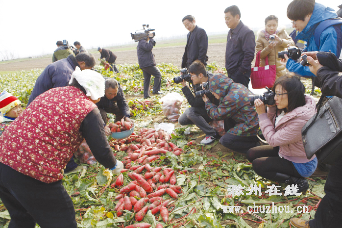 12月1日,明光市泊岗乡安全村田头,来自苏皖两省的新华日报、安徽日报、江苏电视台、南京日报、扬子晚报、滁州日报等16家新闻主流媒体的记者冒着严寒参加聚焦采访“爱心萝卜”新闻公益活动。