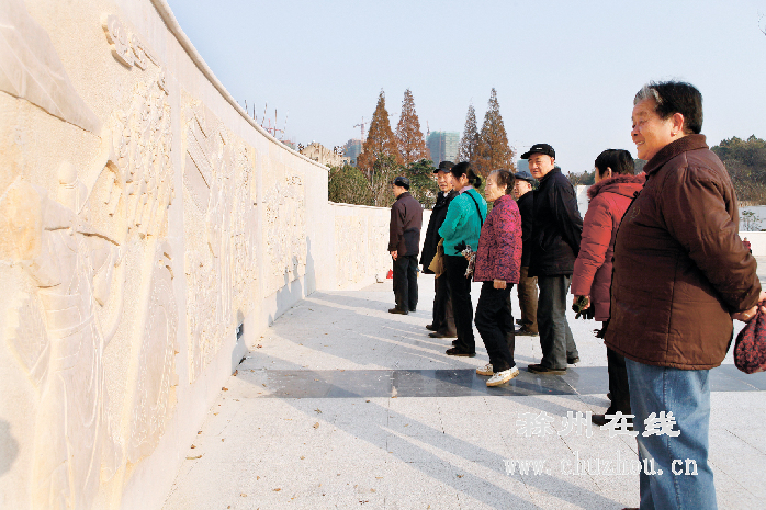 12月13日,在丰乐亭景区,市民在观赏“乐”文化广场上的历史文化浮雕。目前,丰乐亭景区扩建改造一期工程建设基本完工,部分道路、广场、园亭、路灯和植被等设施已经修建和安装铺设完毕。