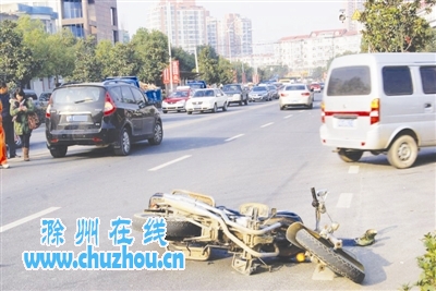 报料内容:近日,滁城丰乐大道城南加油站门前路段,一辆摩托车与一辆轿车相撞后倒地,有人受伤。