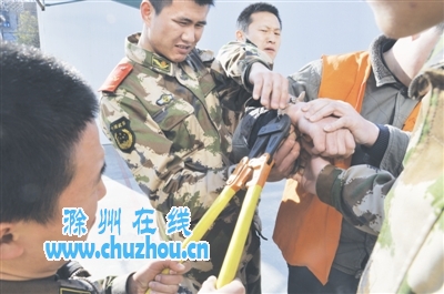 官兵观察发现,手铐死死地卡在疑犯的右手手腕后方,由于长时间卡在手腕上,疑犯右手手腕已经肿涨,他不时发出痛苦的呻吟声。根据情况,官兵们决定利用绝缘剪对手铐进行拆除。为了防止对疑犯造成二次伤害,一名战士负责固定手铐,随后,另一名战士利用绝缘剪成功将其剪断。