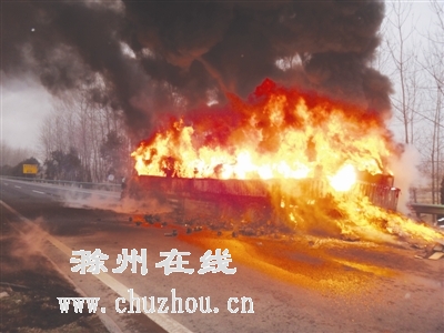 消防官兵到达现场时,发现货车整体燃烧,浓烟滚滚,火势正处于猛烈燃烧阶段,同时发现有数十个不明罐体。据货车驾驶员介绍,车上载有树脂、涂料、油漆等易燃易爆物品。消防官兵一边灭火,同时调来大功率水罐车从后方出一支水枪冷却罐体,约10分钟后,大火基本被扑灭。