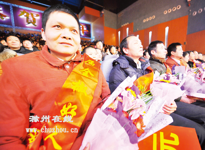 1月15日,全椒县举办2012春节联欢文艺晚会,城乡群众用歌声抒发热爱家乡的豪情;用舞蹈描绘家乡未来发展的宏伟蓝图,充分展示了该县文化建设取得的重大成果。活动中,还表彰了从全县48 万群众中评出的首届“全椒好人”,以推动“三个文明”建设长足发展。图为受表彰的“全椒好人”手棒鲜花观看文艺表演。记者 王家国摄