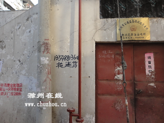 滁城西大街新兴花园小区,小广告铺天盖地,更有许多售迷药、枪支广告。