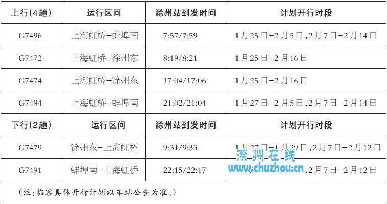 “虽然滁州站节前出行客流不大,但根据客流调查及本地区春运旅客出行规律,计划从1月25日(正月初三)起,乘坐高铁的旅客将迅速上升。”滁州站一负责人说,“为了应对节后客流高峰,上级铁路部门计划在滁州站安排6趟高铁临客,其中,上行4趟、下行2趟。”