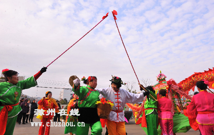 当天上午,在琅琊区政府部门的组织下,来自该区8个街道的民间艺术表演队组成一条长龙,从人民广场出发,沿琅琊大道向西一路载歌载舞,一直表演到区政府,行程2000多米。一路上锣鼓喧天,身怀技艺的表演队员不时做出各种花样动作,引得过路市民纷纷叫好,好一派热闹的场景。