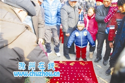春节期间,凤阳县鼓楼文化广场上,许多市民在观看一老人玩套圈套钱的游戏。