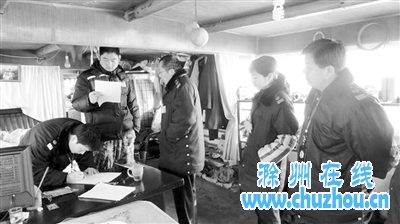 图为执法人员向非法加油船下达《责令停止加油作业通知书》。