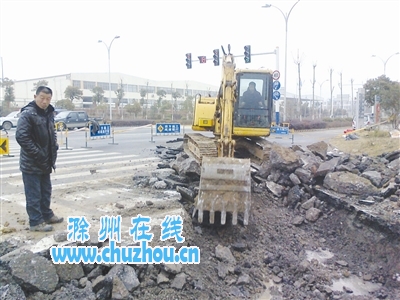 图为挖掘机正在破路面。