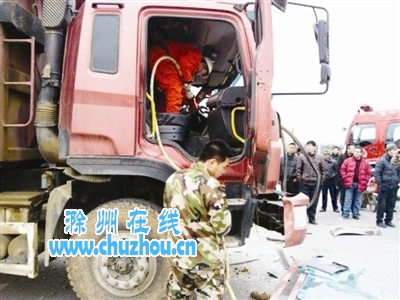 本网讯2月27日下午,在滁城龙蟠大道担子工业园区附近,发生一起三车相撞的交通事故,其中一辆自卸车驾驶员被困车内,并身负重伤。滁州消防特勤中队接警后迅速赶赴现场。