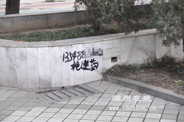 滁城汽车站北侧的游园里,花坛上被印上了小广告。