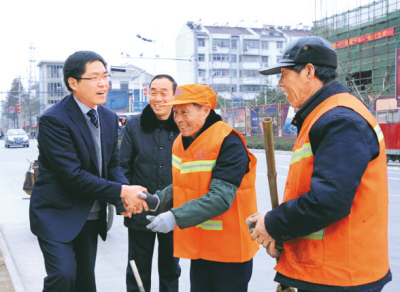 定远县县长王成山(左)慰问环卫工人