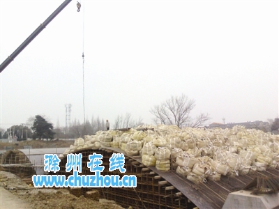 据介绍,每个桥墩上压的泥沙就达1500吨,用千余个可装1吨以上的袋子装上泥沙,然后将一袋袋泥沙用吊机吊至桥墩上,当最后一袋泥沙卸至桥墩上后,再压个5天,模板间隙消失后,就可以倒上混凝土。