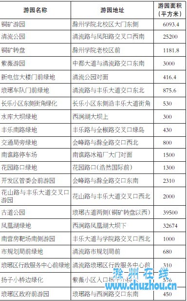 琅琊区政府前游园:位于琅琊路与西涧路交口东南角,绿化面积450平方米。该游园前身为琅琊区政府的一部分,为配合城市拆墙透绿而建设的一座游园。该游园内建设了一座四方亭,亭内配备了可供市民休憩的椅凳,游园内还有一些石雕刻。