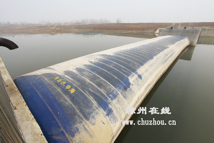 为方便控制不同时期的水位,工程在滁州首建橡胶坝,达到汛期可以防洪,枯水期可以蓄水的目的。橡胶坝工程位于清流河会峰路桥下游约2.3公里处,其主要建筑物由拦河橡胶坝、调节闸及排水泵站等建筑物组成。其中拦河橡胶坝布置于主河槽内,分两跨,单跨坝长50米,共100米,设计坝顶高程为9.7米,底堰槛顶高程5米。调节闸布置于橡胶坝右端,共两孔,孔口长宽都是4米,底槛高程3米。充排水泵站位于橡胶坝右侧堤防背水侧,共布置3台机组,泵站长19.5米,宽10米,底板底面高程2.6米。