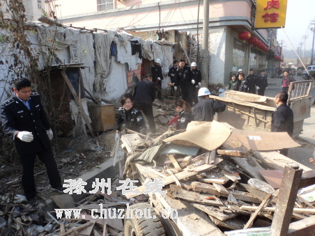 可惜的是,这处“世外桃源”还是被产权单位发现并向城管举报了。按照相关法律程序,负责该片辖区的滁州城管琅琊分局执法人员第一时间赶赴现场下达了法律文书,并多次对江老汉进行宣传劝告,但老汉置若罔闻。规定时限期满后,3月28日上午,该局与清流办事处联手对这处违章搭建进行了拆除。