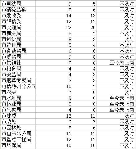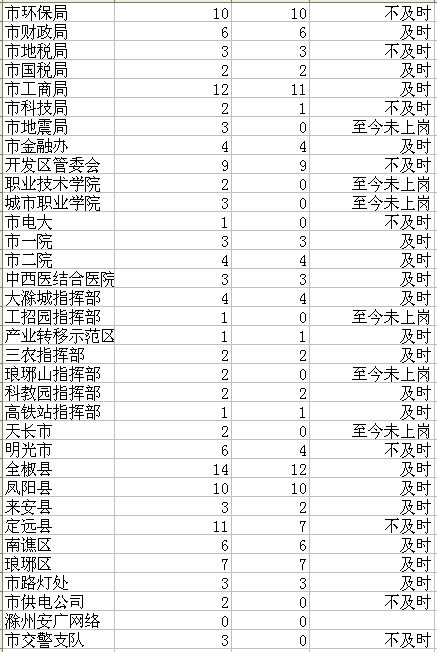 截至2012年3月31日,发言人仍未上岗的有:市外办、市监察局、市招商局、市供销社、市水利局、市林业局、市气象局、职业技术学院、城市职业学院、市电大、市人大办公室、市科协、工招园指挥部、琅琊山指挥部、天长市。