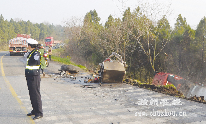来安交警大队接警后第一时间赶赴现场,据了解,S312省道71KM+20米处为S型下坡弯道,南京牌号的大型货车在下坡过程中,因采取措施不当,与危化品运输车辆追尾,导致大型货车右前导向轮脱落,危化品运输车辆侧翻至公路下侧约3米的斜坡上,幸无人员伤亡。