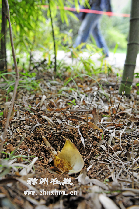 接到施女士的电话后,记者立即赶往琅琊山风景区。刚进入山门不久,记者就发现一片竹林。仔细观察,发现刚刚破土而出的竹笋,大部分都被破坏了。有的竹笋被挖走,有的被折断,被折断的笋子上半部分没了踪影,下半部分还埋在土里,露出新鲜的笋肉。该处几十平方米的竹林,走几步远就能看到一个挖竹笋留下的土坑,竹林里只剩下一部分个头较小的竹笋免遭毒手。记者随后又走访了附近几处竹林,发现被偷竹笋情况基本类似。