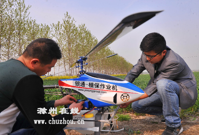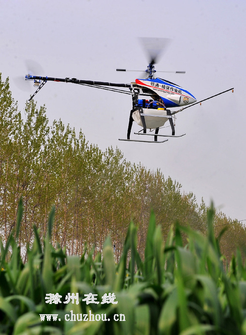 4月8日,一架植保小飞机在南谯区腰铺镇种粮大户王守明承包的麦田上进行喷洒作业演试。2010年,王守明与人合股组建了现代农业开发有限公司,组建优质稻米合作社和农机合作社,目前拥有社员430多户,今年在姑塘村种植小麦7000多亩。为加强植保管理,提升农机装备科技化水平,公司决定投入10多万元,欲购置此类新型喷洒植保小飞机。