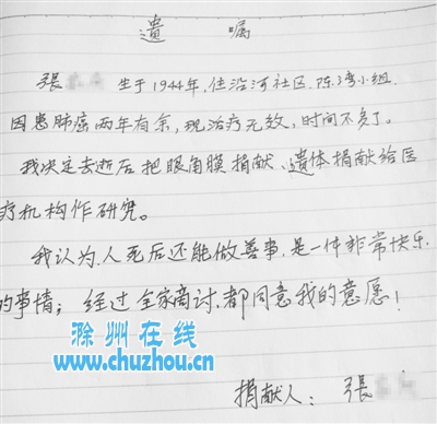 正是卧病在床的这段日子,张先生更多地开始考虑“身后事”。一个偶然的机会,电视上一位78岁的老党员捐献遗体的新闻,让他仿佛“一下找到了目标”。“以前我也想过,但是拿不准我这身体还能不能做,新闻里那个老党员可以,我想我的遗体应该也还有点用。”张先生拿出自己刚拟好的遗嘱,“身体没劲,写得歪歪扭扭的,勉强能看清楚。”虽然罹患绝症,已经体力透支,但这张简单的遗嘱上却工整地写着:我决定去世后把眼角膜、遗体捐献给医疗机构作研究。我认为人死后还能做善事,是一件非常快乐的事情。