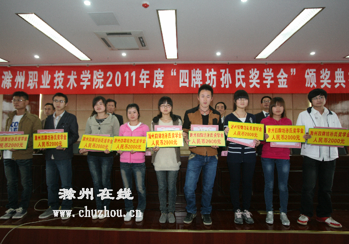 滁州:情系桑梓 扶贫助学 2012-04-23 08:00 我要评论0 扫描到手持设备 字号: 4月18日,滁州职业技术学院举行2011年度“四牌坊孙氏奖学金”颁奖仪式,9位同学每人获得2000元奖学金。“四牌坊孙氏奖学金”由已故滁州籍台湾老先生孙世武设立,旨在资助家庭经济困难且品学兼优的滁州籍在校大学生。自2006年以来,已资助滁州职院44名在校大学生,累计捐助奖学金88000元。李晓村摄 微笑 流汗 难过 羡慕 愤怒 流泪 复制网址 打印 收藏 分享到: 0