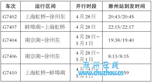“根据上级铁路部门安排,今年‘五一’期间,京沪高铁将实行高峰期运行图,滁州站29趟图定列车将全部上线运营。”滁州站站长肖城市在采访中说。此外,为了缓解突发客流高峰,上级铁路部门计划在滁州站增开5趟临客,其中,上行4趟、下行1趟,开行时段主要集中在4月28日-5月1日(具体车次及停靠时间详见附表)。