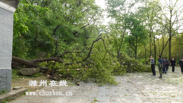 报料内容:我刚才上山锻炼时发现,琅琊山景区洗心亭边的一棵大树因风倒地,砸到了路边的游人,地上流了一滩血。