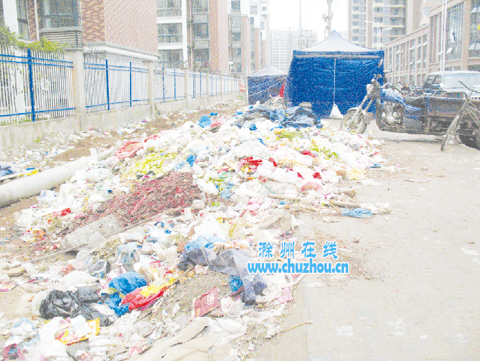 接到市民报料后,记者随即赶到现场核实。在现场,记者看到,龙蟠北苑农贸市场门前马路两边的人行道上,不少小吃摊点纷纷在此安营扎寨,不少生活垃圾也因此堆积在人行道上,不长的路段至今已形成了3个长垃圾带。旁边居民告诉记者,垃圾堆积已有很长时间了,但至今无人过问此事。