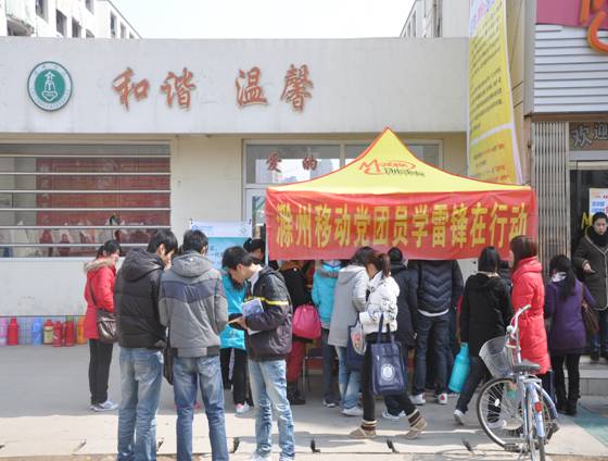 志愿者行动。志愿者们利用休息时间,下乡村、到广场、进社区,学雷锋送服务到基层,现场为群众提供手机和小家电维修服务。在滁州移动,这样的志愿活动从未间断过。关爱弱势群体,定期走访社会福利院,为孤寡老人和智残儿童送去亲人般的温暖;关爱留守儿童,为他们送去书包等学习用具,并开通亲情长途,让留守儿童使用免费电话联系在外务工的父母亲人;开展公共区域环境卫生大扫除,志愿者们走上街头,清理人行道、绿化带,擦洗公交车牌、垃圾回收箱,受到广大市民一致称赞;参加文明交通志愿者活动,在上下班等人流高峰期,帮助交警疏通交通,进行文明出行宣传,倡导安全行车;自发组织开展捐资助学活动,捐献爱心款20余万元,帮助近百名寒门学子继续学业。