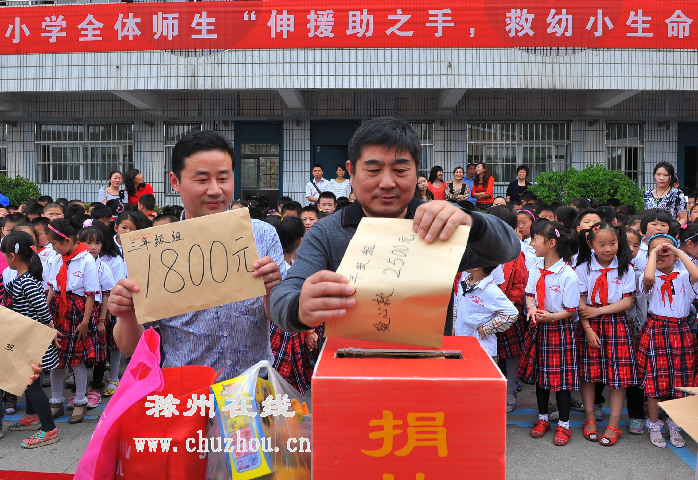 一个多月前,滁城解放小学一年级学生赵旭东突患重病,贫困的家庭无力支付巨额的医药费。就在一家人一筹莫展之时,昨日上午,解放小学掀起了一场爱心救助活动,全校3600多名师生踊跃捐献,共帮旭东一家人筹得爱心款126587元。“有了这些钱,孩子的命就有希望了。谢谢解放小学、谢谢所有关心和帮助我们的人。”昨天下午,旭东的爸爸赵海滨感动地说。