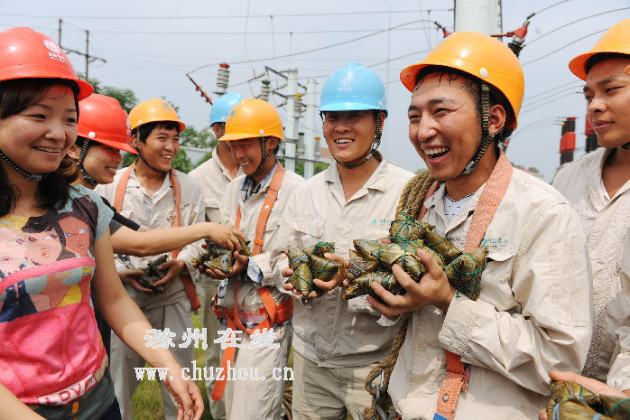 6月20日,在全椒县襄河镇35千伏城郊变电站建设工地,农民工在品尝供电公司送来的粽子。当日,全椒供电公司特别制作了风味多样的粽子,送给在襄河镇35千伏城郊变电站建设工地一线劳动的农民工兄弟品尝,让农民工们在端午节前吃上香喷喷的粽子,感受到家的温馨。特约摄影 宋卫星
