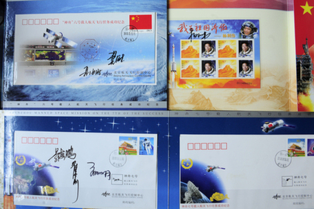 除了神舟系列的纪念银章,曹磊还收集了神舟系列纪念邮品。神舟五号到神舟七号的三次载人飞行后,他收集到3个纪念封,上面分别有杨利伟、费俊龙、聂海胜、翟志刚、刘伯明和景海鹏的亲笔签名,更加特殊的是一封“天外来信”——由神舟八号无人飞船搭载上太空的纪念封。