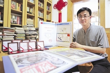 采访快结束时,曹磊搬出一摞报纸,“这些都是媒体关于神舟飞天的号外,有近百份。”其中一份“神六快讯”引起了记者的注意,曹磊说这是从北京航天控制中心庆祝发射现场地上捡起来的,到他这里成了宝贝,“这是航天部门内部刊物,尤为珍贵。”曹磊说,他想把纪念章、邮品连同报纸一起,办个航天主题的展览,面向社会,让更多的滁州人了解中国航天事业。