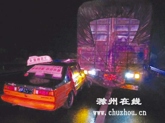 这时,徐师傅看到前面有辆大货车,没有多想就一脚油门撞了上去。巨大的撞击力,致使出租车死死“咬”住大货车左侧尾部。