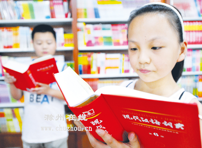 7月16日,新版《现代汉语词典》在滁州市新华书店上架销售,两名小朋友正在饶有兴趣地翻阅。15日,由商务印书馆出版的《现代汉语词典》第6版正式发行,新版词典增添词语3000多条,收录对老百姓有影响的239个词汇,包括PM2.5、雷人、地沟油、摇号、陪聊、犀利哥、劈腿、父亲节、情人节、月光族、微博、忽悠等。记者 王家国摄