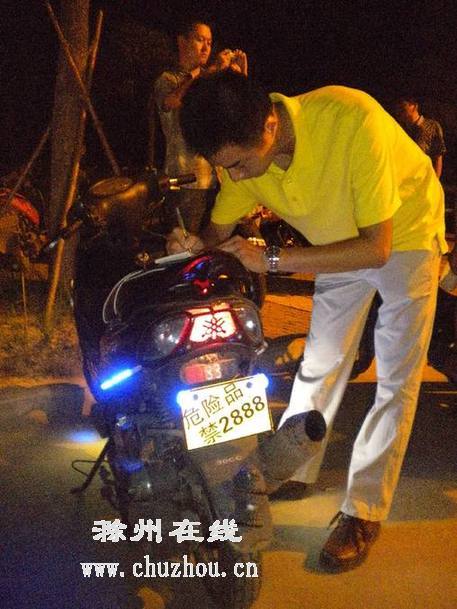 20日晚上21时许,滁城西外环水岸帝景小区和琅琊区政府旁边,10余辆警车悄悄停下,近60名便衣大汉陆续下车,从两端向凤凰湖步行集结。原来,他们全部是滁州市交警支队民警,当晚奉命整治被称为“小飞机”的改装轻便摩托车。之所以着便装,是为了不引起“小飞机手”们的注意,方便突袭,打个措手不及。
