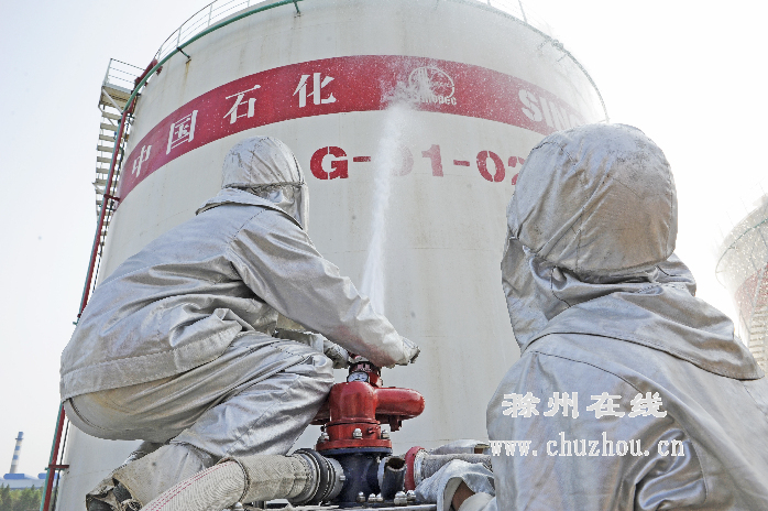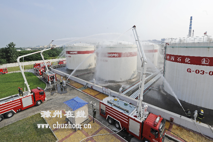 夏季高温,雷电较多,一些易燃易爆场所一旦遭受雷击,容易引起火灾事故。为提高我市消防部队处置易燃易爆场所火灾事故水平,当天市消防支队在滁州中石化油库进行消防灭火演习,灾情设定为2号汽油罐因雷击发生爆炸起火。图为演习现场。 记者 计成军摄