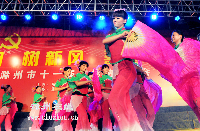 开场歌舞《和谐滁州》热闹欢腾,美文朗诵《爱莲说》清雅恬淡,还有“滁州好人”陈登宝、徐正传等登台讲述感人事迹……昨夜的广场露天舞台人气“爆棚”,欢歌笑语久久萦绕,市民们听得过瘾,玩得很High。据悉,今夏还将有14场晚会陪伴市民清凉过夏天。图为开幕式上表演的舞蹈节目。